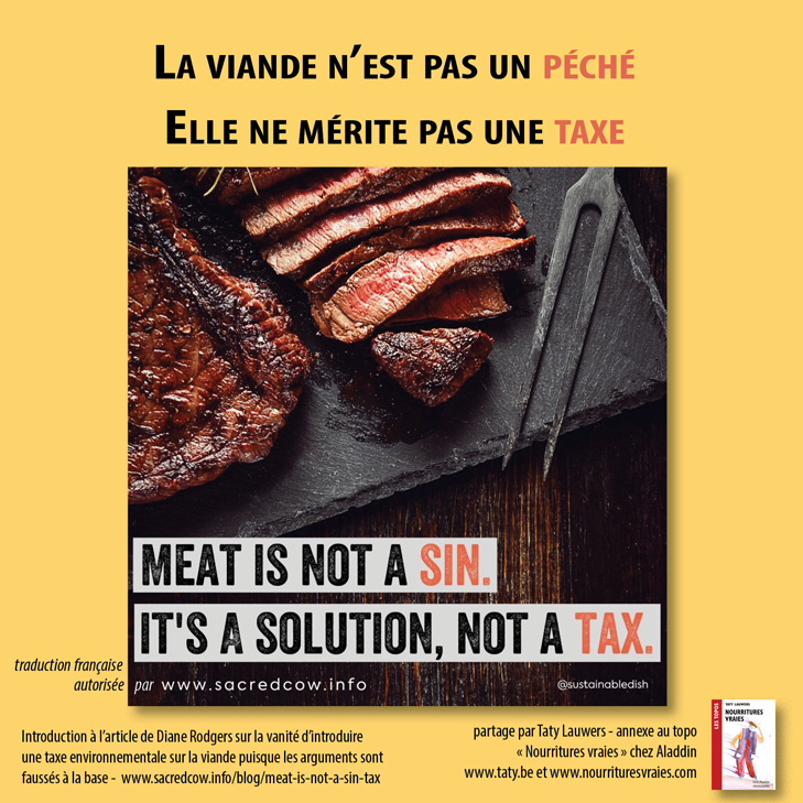 11.01.2020 Je continue sur ma lancée: réfléchissons un peu les slogans simplistes qui nous sont balancés tous les jours sur les réseaux sociaux. En anglais, une taxe environnementale se dit "taxe de péché". Certains pays européens proposent de taxer la viande, mais elle n’est pas un péché! Elle ne mérite pas une taxe, vu que les arguments sont faussés à la base. Les animaux élevés en pâture raisonnée seraient même partie de la solution pour protéger la planète. Voilà ce qu'explique l’article de Diane Rodgers sur la vanité d’introduire une taxe environnementale: Meat is not a sin tax.