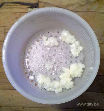 2009. L'ami kéfir. Elle est pas belle, la vie? J'ai oublié des grains de kéfir dans leur lait cru dans un réfrigérateur de dépannage, à la buanderie, pendant trois mois... Le tout est un peu sec désormais, grains y compris. Je les ai égouttés puis revivifiés à base d'eau sucrée pendant deux jours, puis de lait pendant deux jours supplémentaires. Ensuite, on a pu commencer à le déguster, il était reparti... Quel formidable aliment!