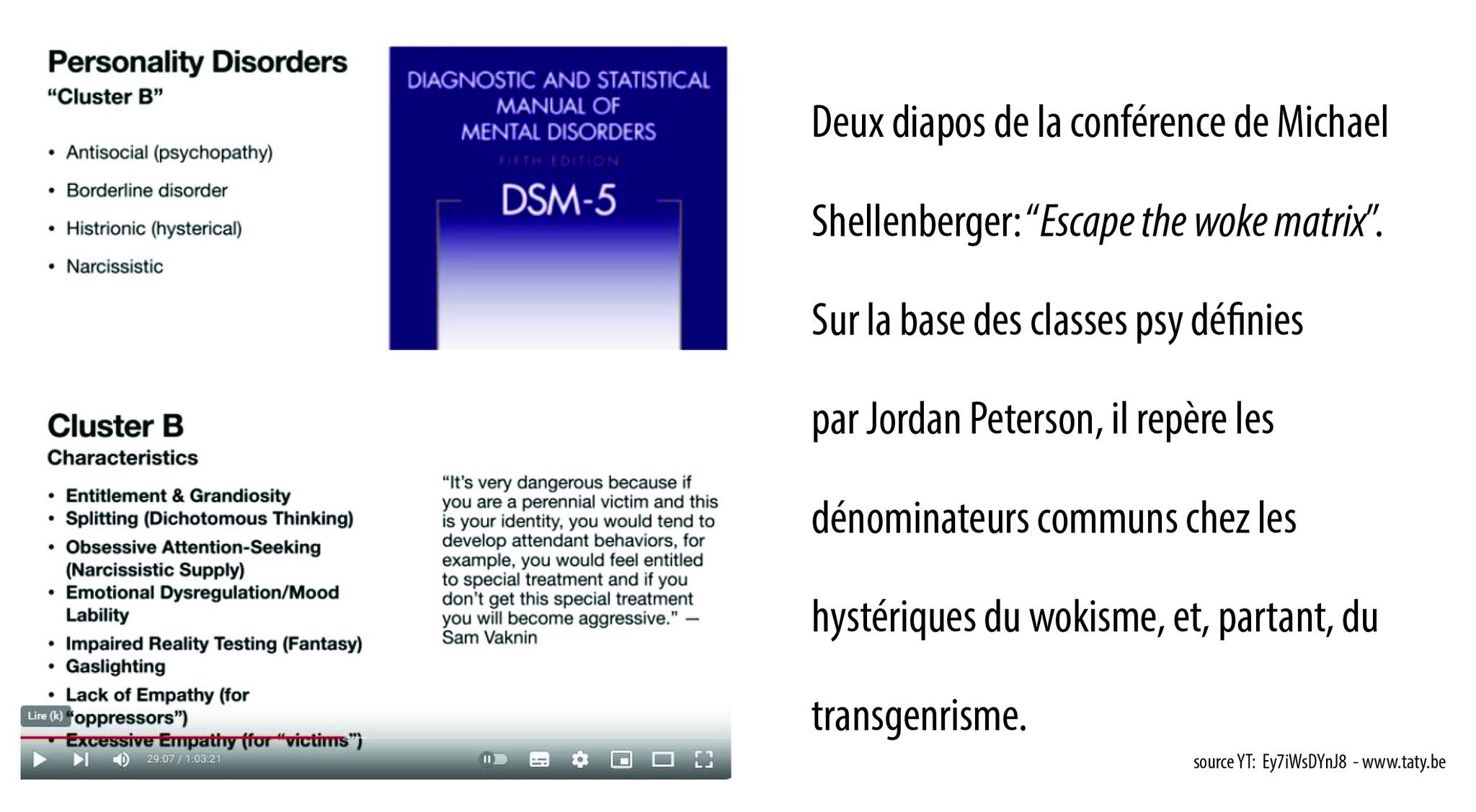 NB. Par rapport à d'autres "docteurs en psychologie" dont on finit par se demander s'ils ont reçu leur diplôme dans un paquet de lessive (les lecteurs savent de qui je parle), Jordan Peterson développe une analyse fine, variée, documentée par statistiques et longues recherches. Fondées sur la typologie jungienne. Les hystériques wokistes ne sont pas simplement "des pervers narcissiques". L'analyse est bien plus fine.