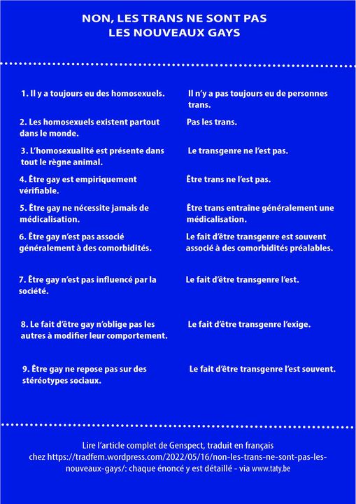 Lire l’article complet de Genspect, traduit en français chez https://tradfem.wordpress.com/2022/05/16/non-les-trans-ne-sont-pas-les-nouveaux-gays/: chaque énoncé y est détaillé