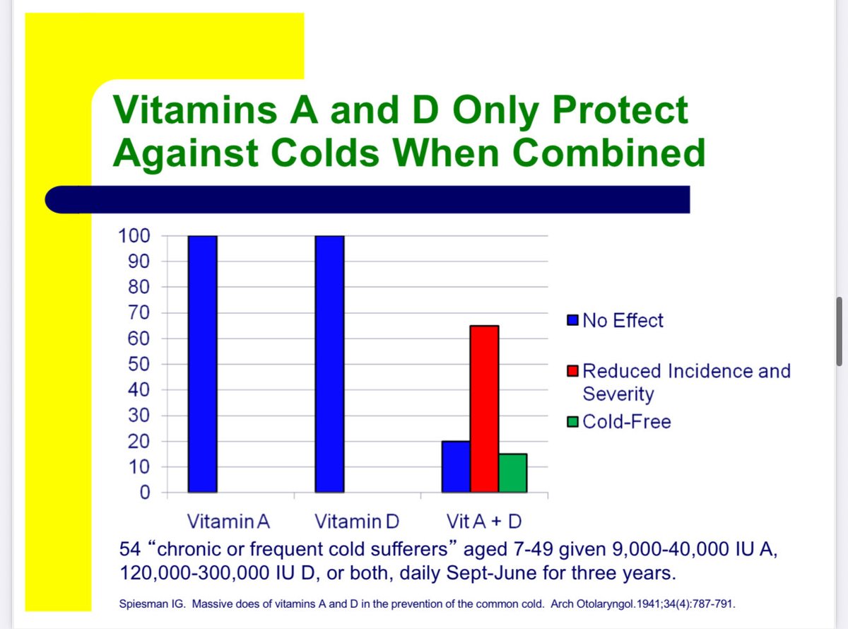 Dès 1941, IG Spiesman a montré que les vitamines A et D préviennent le rhume lorsqu'elles sont administrées ensemble et ne font absolument rien lorsqu'elles sont administrées seules.