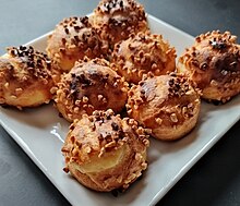 Pâte à choux: 1/4 litre deau, 100g de beurre fermier, pincée de sel, 25 g de sucre, 125g de farine, 4 oeufs
