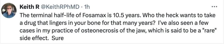 Traduction: La demi-vie de Fosamax est de 10.5 ans. Qui donc voudrait prendre un médicament qui zone dans les os pendant de si longues années? Dans ma pratique médicale, j'ai vu quelques cas d'ostéonécrose de la mâchoire alors qu'il est dit que c'est un effet secondaire "rare".