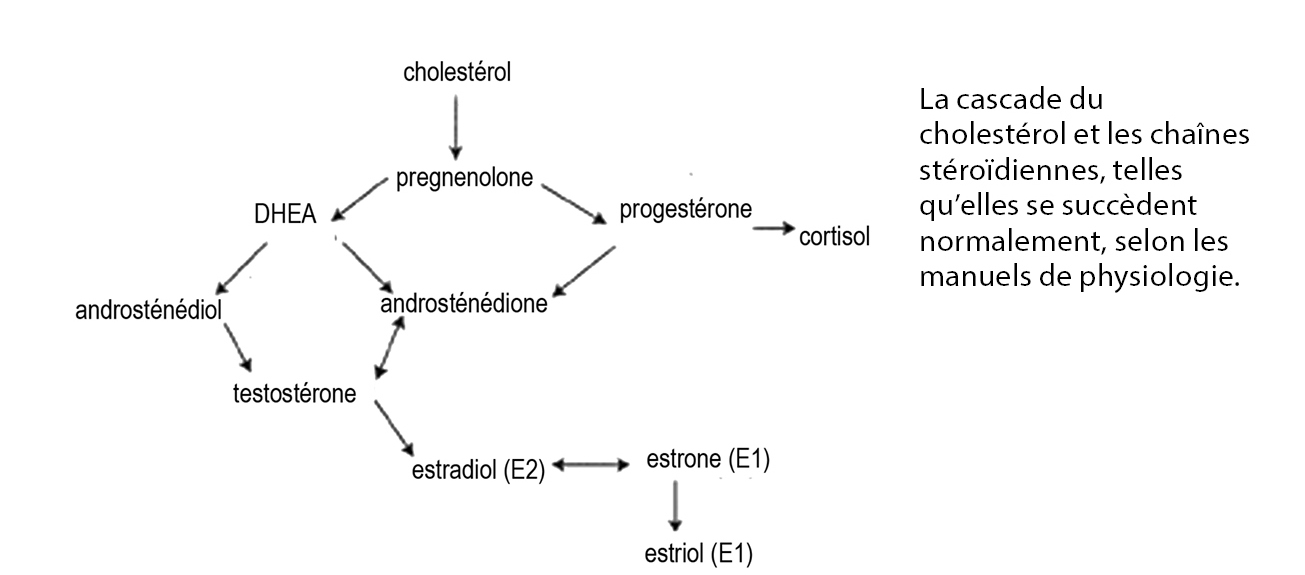 Selon les manuels de physiologie, lorsque le corps veut produire ces hormones, une cascade de réactions se déroule à partir du cholestérol, qu’il soit endogène (produit par le foie) ou alimentaire (beurre & Cie). Je représente en images ci-dessous ce qui se passe dans l’idéal - image du haut.