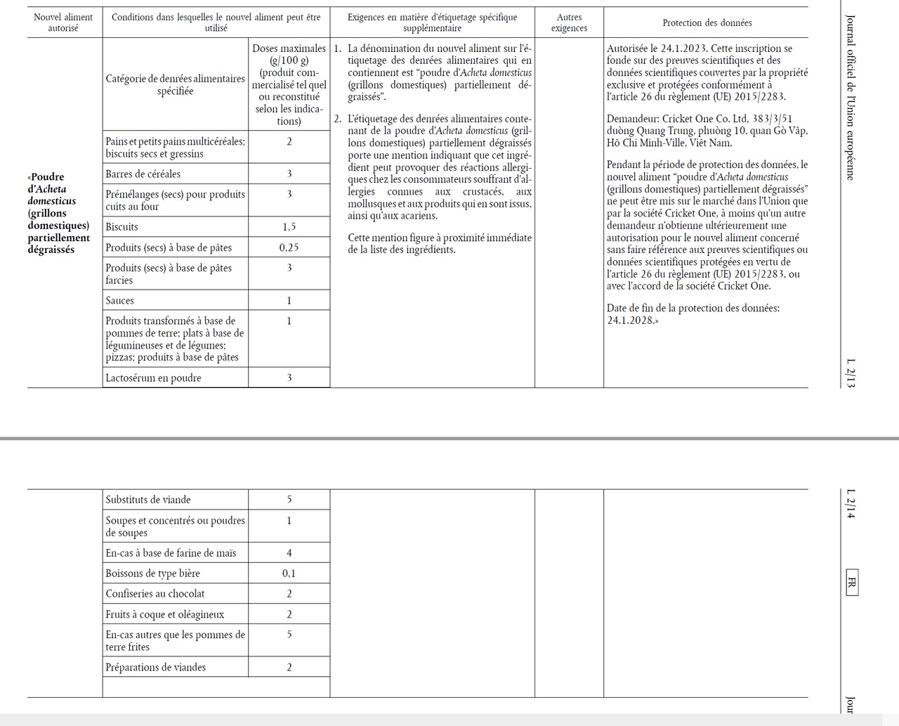 L'étiquetage n'est obligatoire que si le produit contient de la poudre d'"Acheta domesticus".
