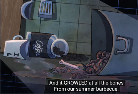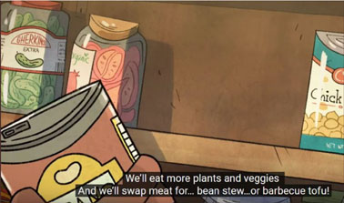 "Un monstre dans ma cuisine... des griffes si acérées... qu'elles pourraient déchirer un enfant en deux... De la nourriture pour poulets, porcs et vaches pour vous vendre plus de viande..."