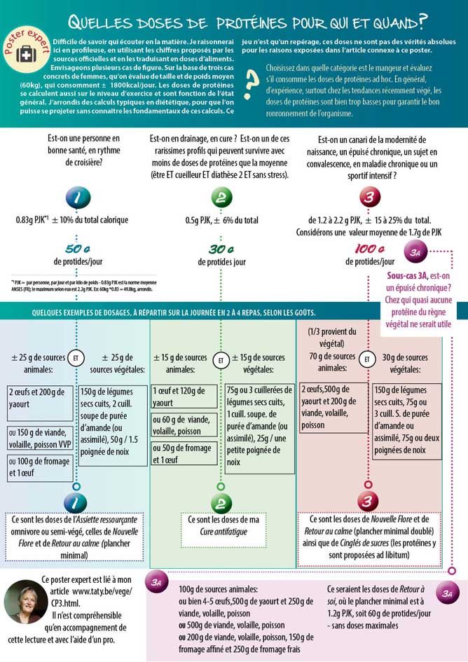 Autre précision par rapport à ce poster. Je repère quelle cure utilise quel dosage de protéines. Si c’est une pancarte bien utile dans votre chemin de soi, ce n’est pas un cadre fermé. Dans les grilles que je publie dans chaque cure, j’indique clairement qu’il s’agit de grilles illustratives. Elles sont conçues à l’intention de ces mangeurs qui ont besoin d’un cadre pour commencer. Dicter des dosages serait bien incohérent au sein d’une collection où je prône l’écoute de soi.