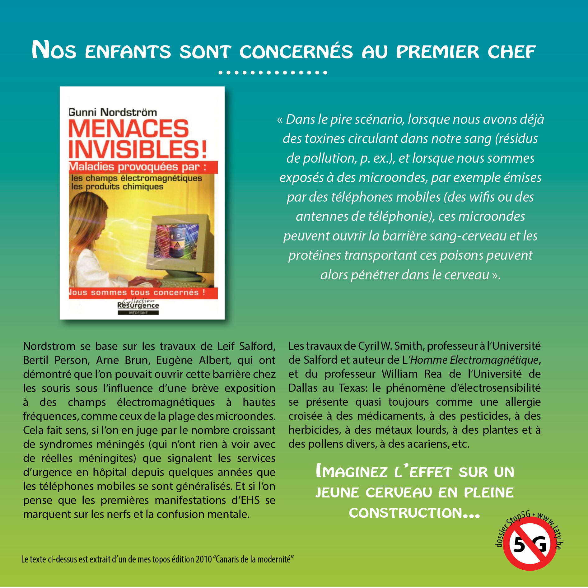 « Dans le pire scénario, lorsque nous avons déjà des toxines circulant dans notre sang (résidus de pollution, p. ex.), et lorsque nous sommes exposés à des microondes, par exemple émises par des téléphones mobiles (des wifis ou des antennes de téléphonie), ces microondes peuvent ouvrir la barrière sang-cerveau et les protéines transportant ces poisons peuvent alors pénétrer dans le cerveau ».