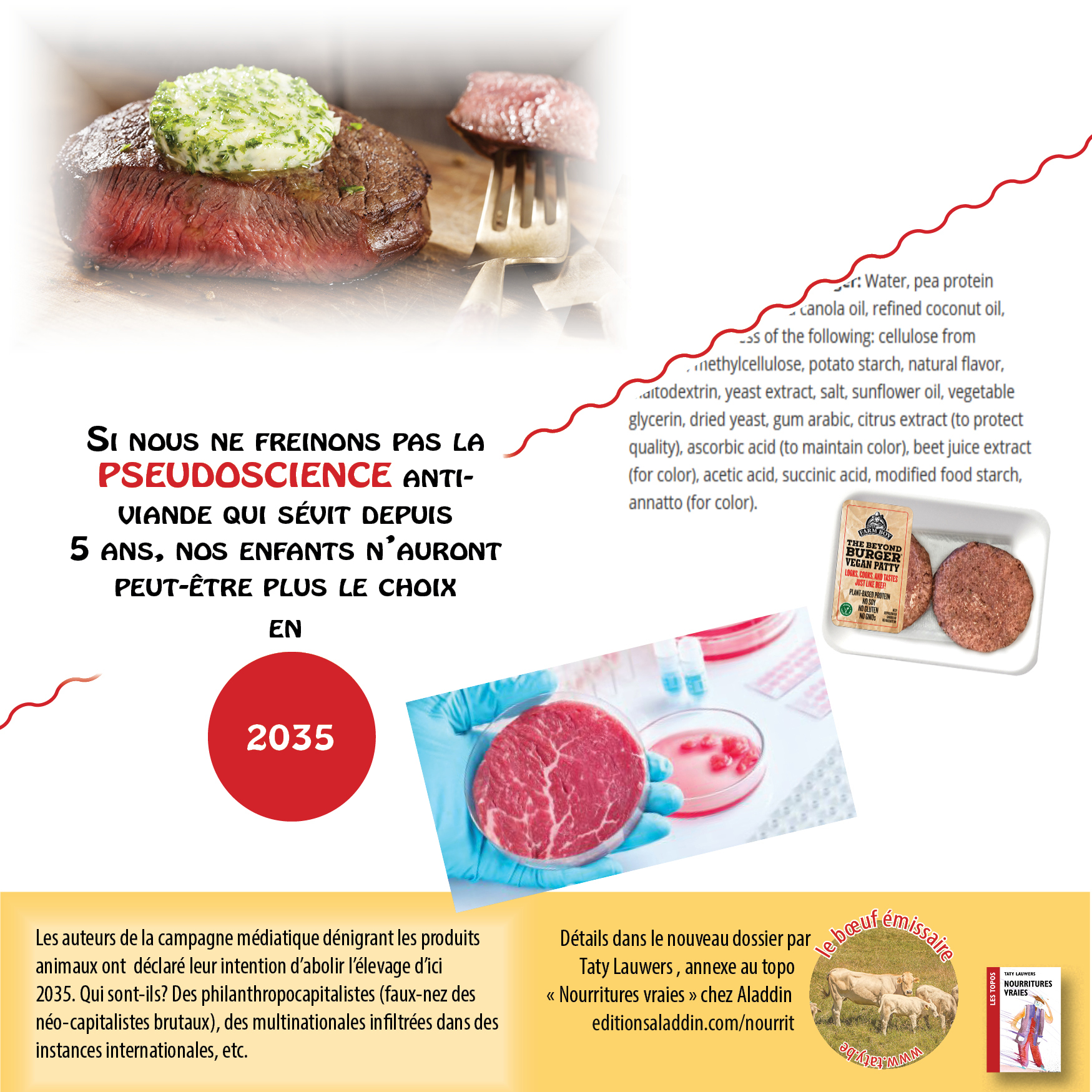 Ecolos convaincus, mes frères et sœurs de cœur, je vous invite à revoir la communication antiviande avec soin, selon ce que je peux qualifier de « rumeurs » autour de la viande, du climat et de la santé — rumeurs qui ont été distillées dans les medias par Big Food et quelques millionnaires avides de nouveautés. Laissez-moi vous révéler en images, ci-après, ce que nous préparent ceux qui ont concocté cette campagne de diffamation. La technoscience de ce domaine est détournée à des fins matérielles par de gros intérêts financiers. Sous le couvert d’écologie, voici ce qu’ils préparent pour nos petits, nous leurrant au passage en employant nos propres arguments écologiques