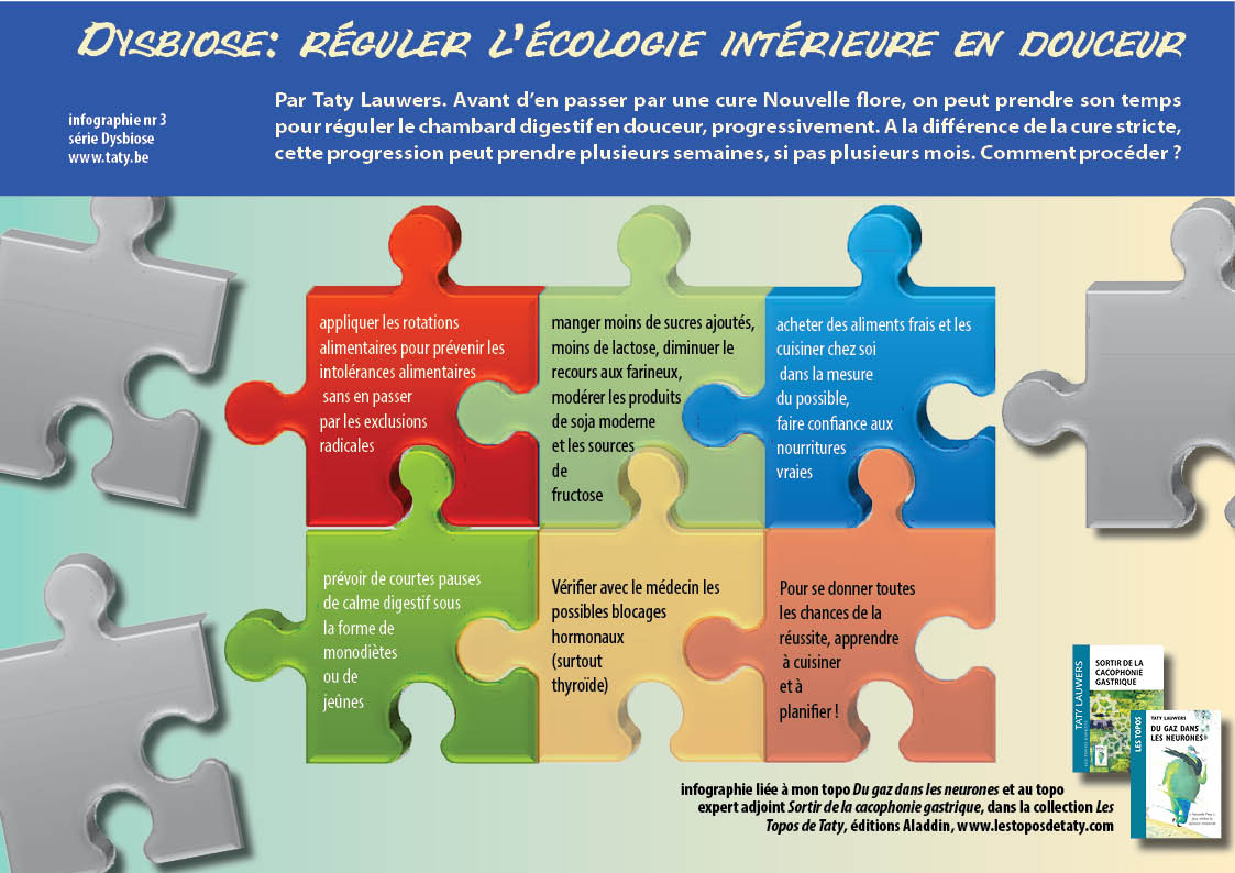 <a href="https://www.taty.be/dugaz/DG3regulerdouceurinfogr.html">"Dysbiose: réguler l’écologie intérieure en douceur, par Taty Lauwers - www.taty.be</a>.</p>