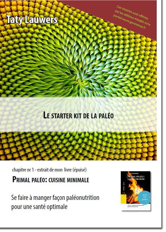 En association avec Aladdin, ma maison d'édition, j'ai le plaisir de vous offrir un dossier digital, à télécharger (44 pages au format A5, à imprimer en vis-à-vis pour un A4 de 22 pages): un chapitre entier de recettes, de commentaires, de trucs et astuces, extrait de ce livre épuisé, qui était le tome compagnon pratique du topo Paléo: le bon plan.