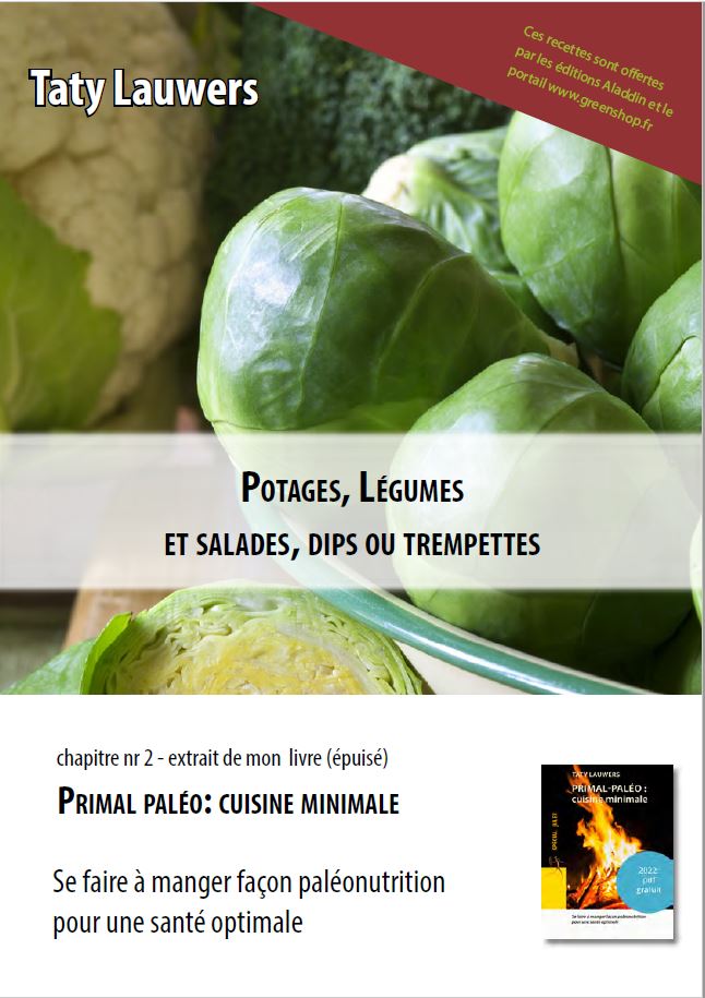 En association avec Aladdin, ma maison d'édition, j'ai le plaisir de vous offrir un dossier digital, à télécharger (54 pages au format A5, à imprimer en vis-à-vis pour un A4 de 27 pages): un chapitre entier de recettes, de commentaires, de trucs et astuces, extrait de ce livre épuisé, qui était le tome compagnon pratique du topo Paléo: le bon plan.